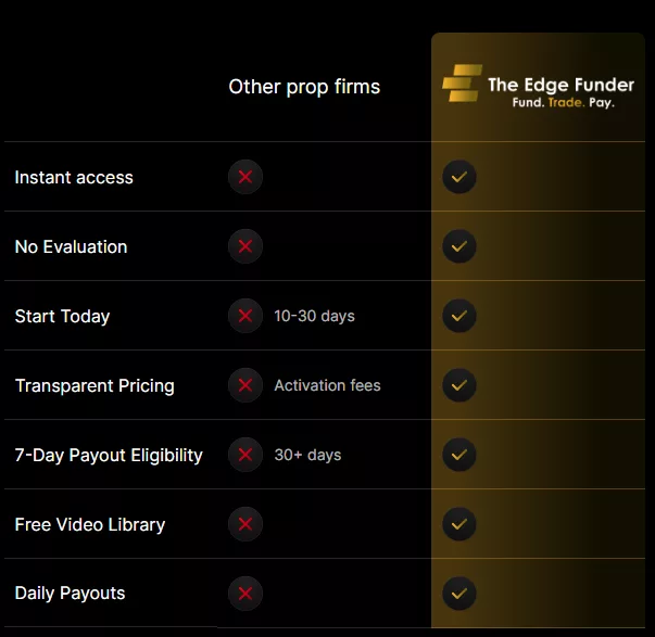 The Edge Funder is our #1 recommended Prop Firm funded account. The Edge Funder offers true instant access, no evaluations, and fast payouts without the typical delays or hidden fees. While other firms slow you down with red tape and long wait times, The Edge Funder has built a system that gets you funded and trading right away. Skip the fluff — start growing your account with a firm designed for serious traders.
